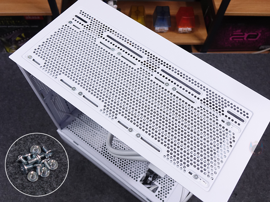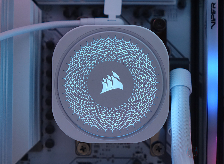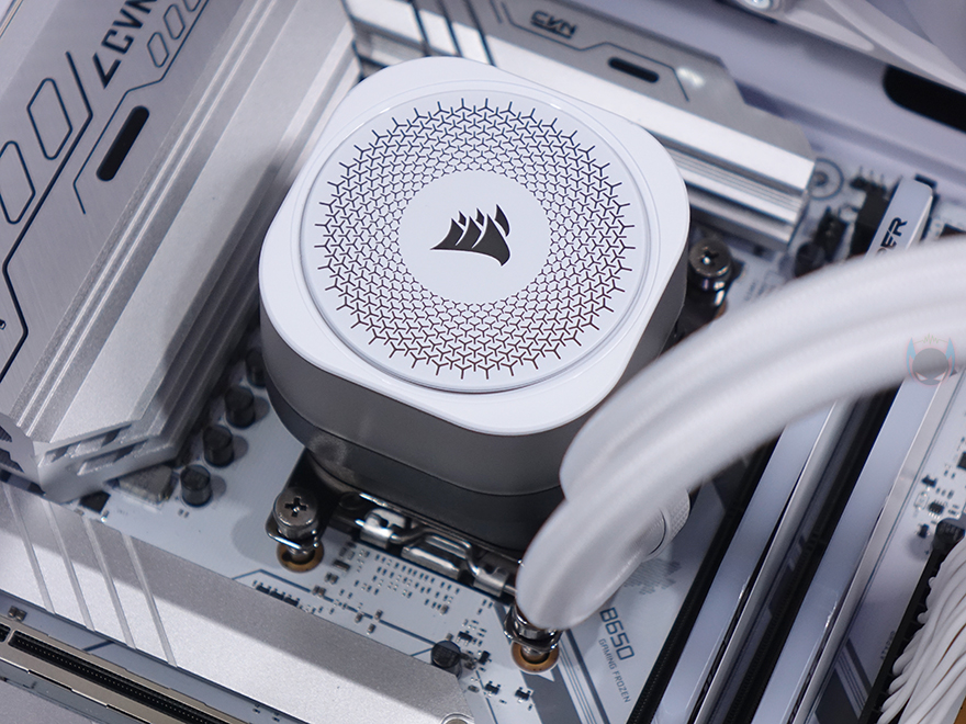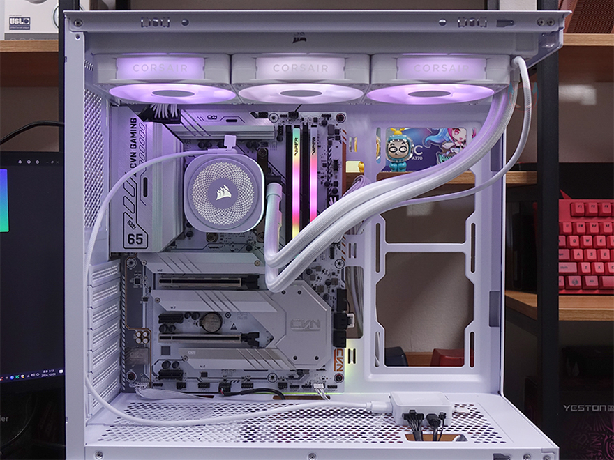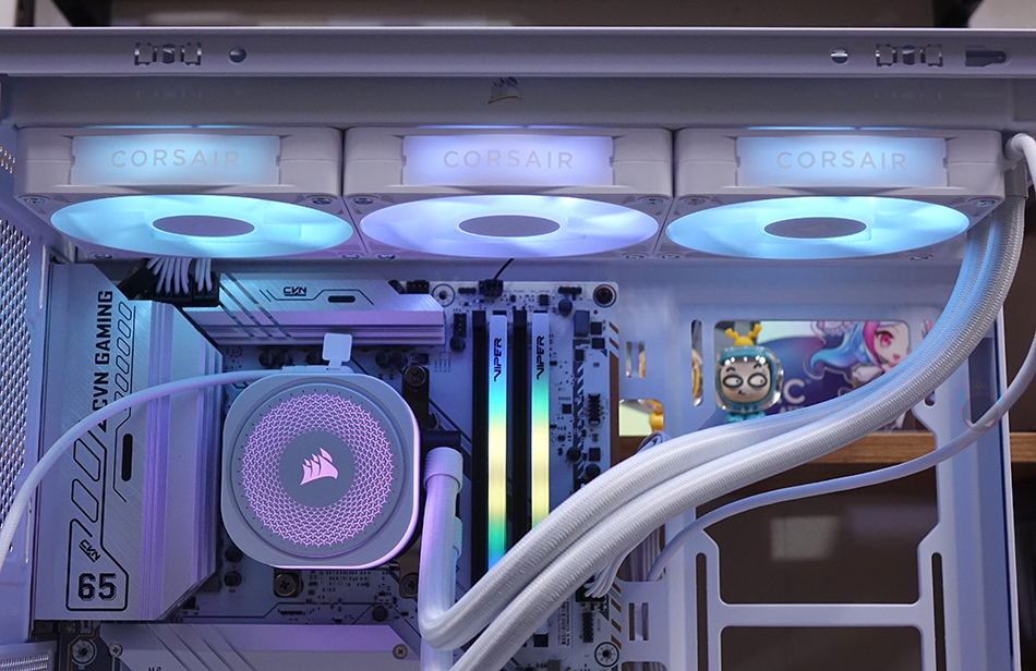허브장치까지 연결을 마친 후, PC를 켜면 바로 라디에이터에 장착된 RX RGB 팬과 워터블록에서 기본 RGB 라이트 효과를 확인할 수 있습니다. 그리고, 앞서 확인했듯이 워터블록의 상판 로고 부분은 탈착식 플레이트라 쿨러 위치에 따라 언제든지 로고 전면으로 배치할 수 있습니다. 또한, 라이트 밝기도 일반적인 RGB처럼 단조롭게 과하지 않으며, 파스텔처럼 은은한 감성적인 느낌이라 눈에 들어오는 시각효과 피로감도 적습니다.