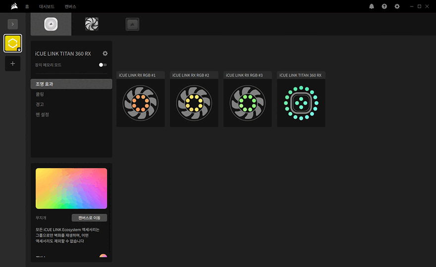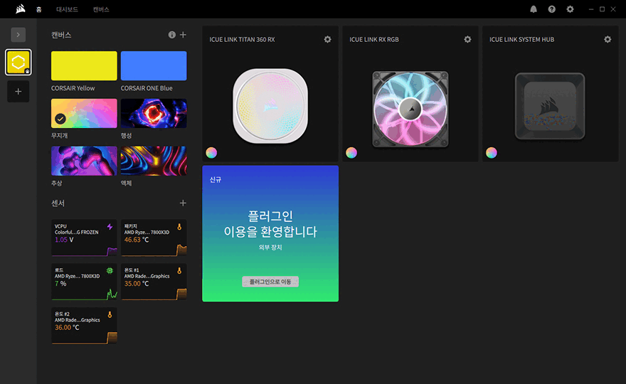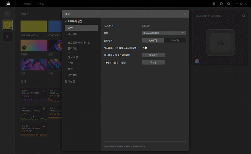 물론, iCUE Link 허브 장치가 제공되는 제품인 만큼 iCUE LINK TITAN 360 RX RGB 일체형 수랭쿨러를 제대로 관리 사용하기 위해서는 iCUE 소프트웨어를 함께 사용해야 합니다. 소프트웨어는 커세어 홈페이지에서 다운로드할 수 있으며, 설치 후 프로그램을 실행해 보면, 메인화면에서는 조명 설정의 캔버스, 센서, 기본 장치로 인식된 워터블록, RX RGB 팬, iCUE Link 허브 장치를 한눈에 모니터링할 수 있습니다. 시스템 모니터링을 할 수 있는 센서 부분을 더 자세하게 보고 싶다면, 대시보드 메뉴로 들어가면 되고, 캔버스에서는 기본 설정된 조명 효과 외에 추가 조명 효과를 적용할 수 있습니다. 그리고, 장치로 인식되는 워터블록, RX RGB 팬, iCUE Link 허브 역시 세부 설정을 할 수 있는데, 3개의 장치 모두 기본 조명 효과 및 설정을 할 수 있고, 워터블록과 팬은 추가로 쿨링 설정을 할 수 있으며, 워터블록에서 경고와 팬 설정까지 총 4가지 설정을 다룰 수 있습니다. 그리고, iCUE 프로그램 설정 메뉴를 통해서는 소프트웨어 설정과 장치 설정으로 나뉘어서 메뉴를 확인할 수 있는데, 소프트웨어 설정을 통해서는 프로그램 기본 실행값과 대시보드, 업데이트, 타사 제품의 프로그램과 연동할 수 있는 플러그인, 센서로깅, SDK 등을 설정할 수 있습니다.
