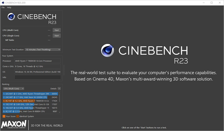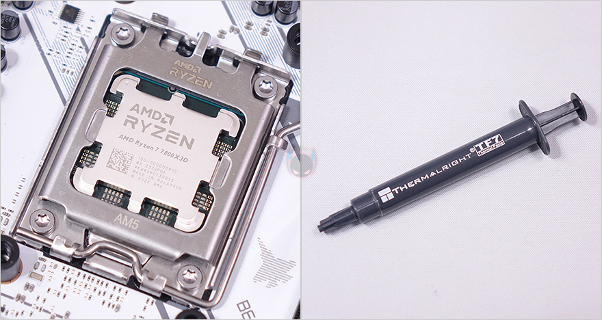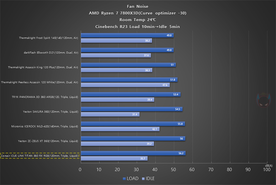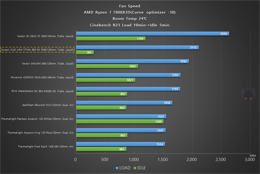이제 끝으로, iCUE LINK TITAN 360 RX RGB 일체형 수랭쿨러의 쿨링 성능을 확인해 보는데, 최근 인텔/AMD CPU 모두 기본 부스트 클럭이 높게 작동하기 때문에, 예전처럼 소비자가 수동적으로 오버클럭을 하는 매리트는 많이 사라졌습니다. 현재, 가장 인기 있는 CPU라 할 수 있는 AMD 라이젠 7 7800X3D만 해도 오버클럭 지원을 하지 않죠. 그래서, 라이젠 7 7800X3D CPU를 사용해 커브드옵티마이저(-30)를 적용해서, Cinebench R23을 10분간 실행한 과부하 100% Load 상태일 때와 이후 5분간 Idle 상태일 때의 CPU 온도와 팬 속도와 소, 그리고 냉각 성능에 따른 CPU 최대 클럭 작동을 확인해 봤습니다. 참고로, 다른 CPU 쿨러들과 비교를 위해 써멀 그리스도 동일하게 사용했습니다.
