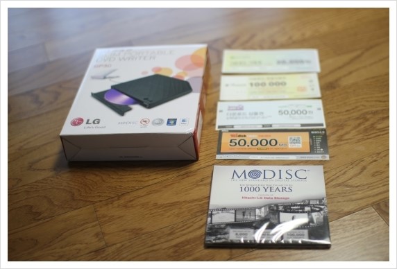 포장을 뜯어보니 기기본체와 M-DISC 1장, 그리고 기타 쿠폰들이 있네요..
