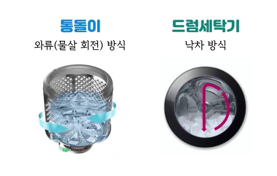 반면, 드럼세탁기는 낙차(위 → 아래) 방식으로