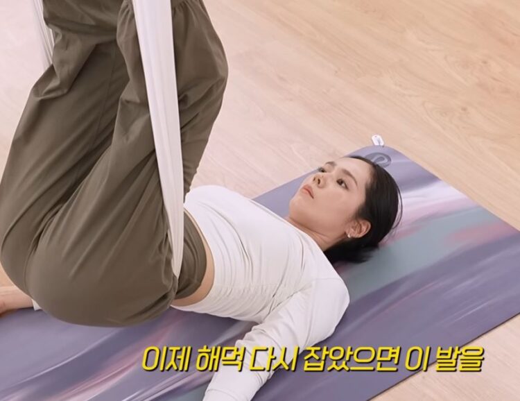 또 영상에서 한가인이 참여한 플라잉 요가는 해먹을 이용해 몸을 공중에서 지지한 상태로 여러 동작을 수행하는 것이다. 전신 근육을 사용해야 하며 균형감각과 코어 안정성을 동시에 강화하는 효과가 있다. 특히 해먹에 의지한 채 거꾸로 매달리는 동작은 상체 쪽 혈류를 늘려 혈액 순환을 개선한다.
