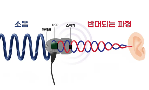 이어폰/헤드폰 마이크가 주변 소음을 감지하여 반대되는 소리 (역위상 음파)를 발생시킴