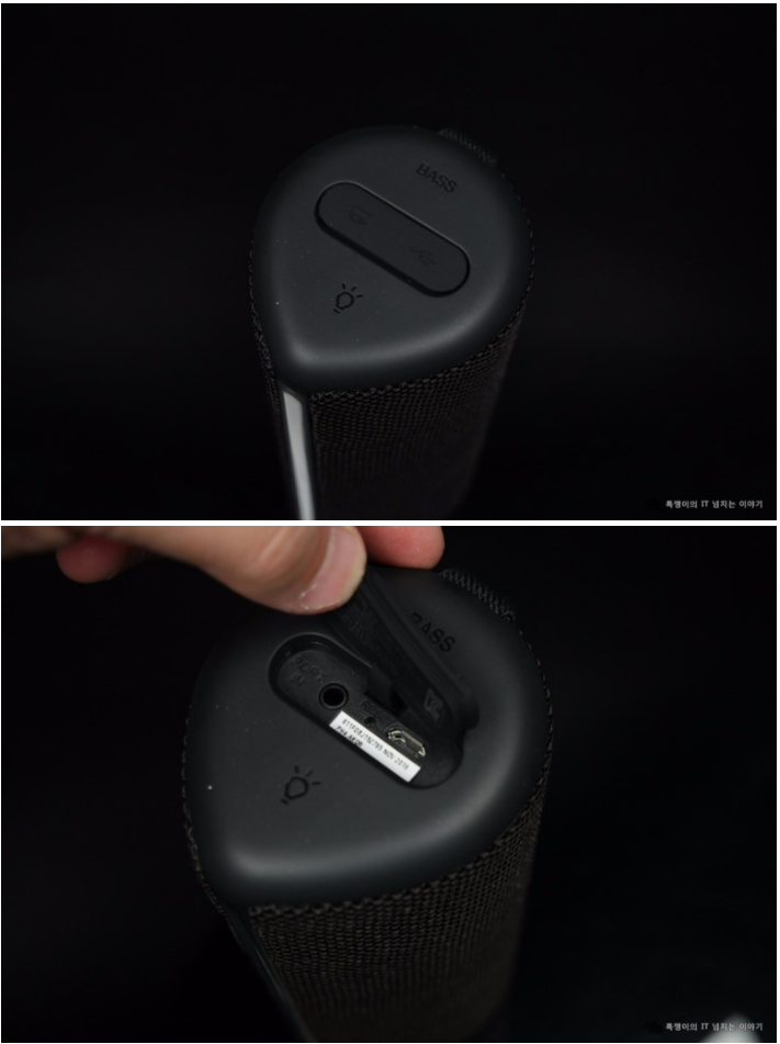 또한, 아래쪽에는 라이트를 온 오프할 수 있는 버튼과 함께 야외에서 사용하면 좋은 베이스 강화 버튼이 있으며, 가운데에는 연결단자가 덮게로 덮여 있습니다. 덮게를 열면 3.5파이 단자와 함께 리셋 버튼, 마이크로 5핀 충전 포트가 있는 것을 알 수 있습니다.