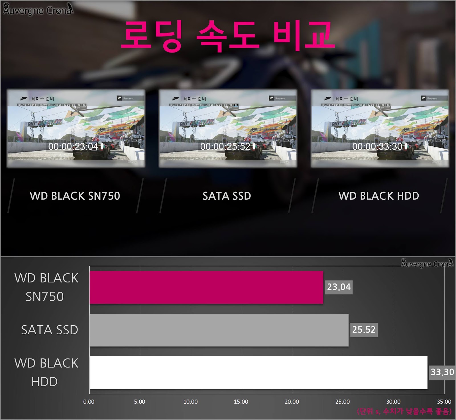 ▲ 해당 테스트에서는, SN750이 23.04초, SATA SSD는 25.52초, WD BLACK HDD는 33.30초를 기록했습니다.