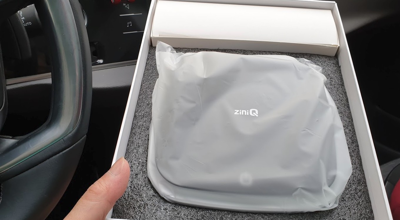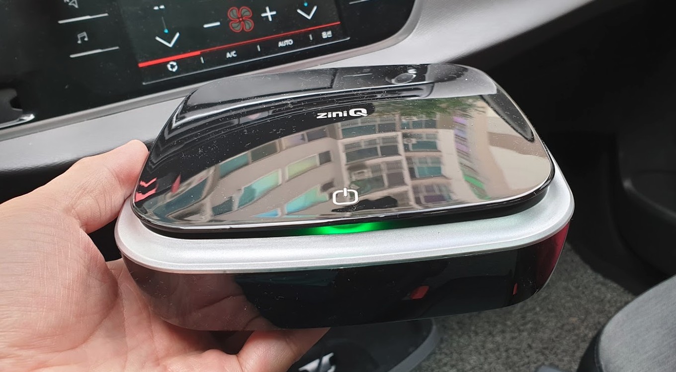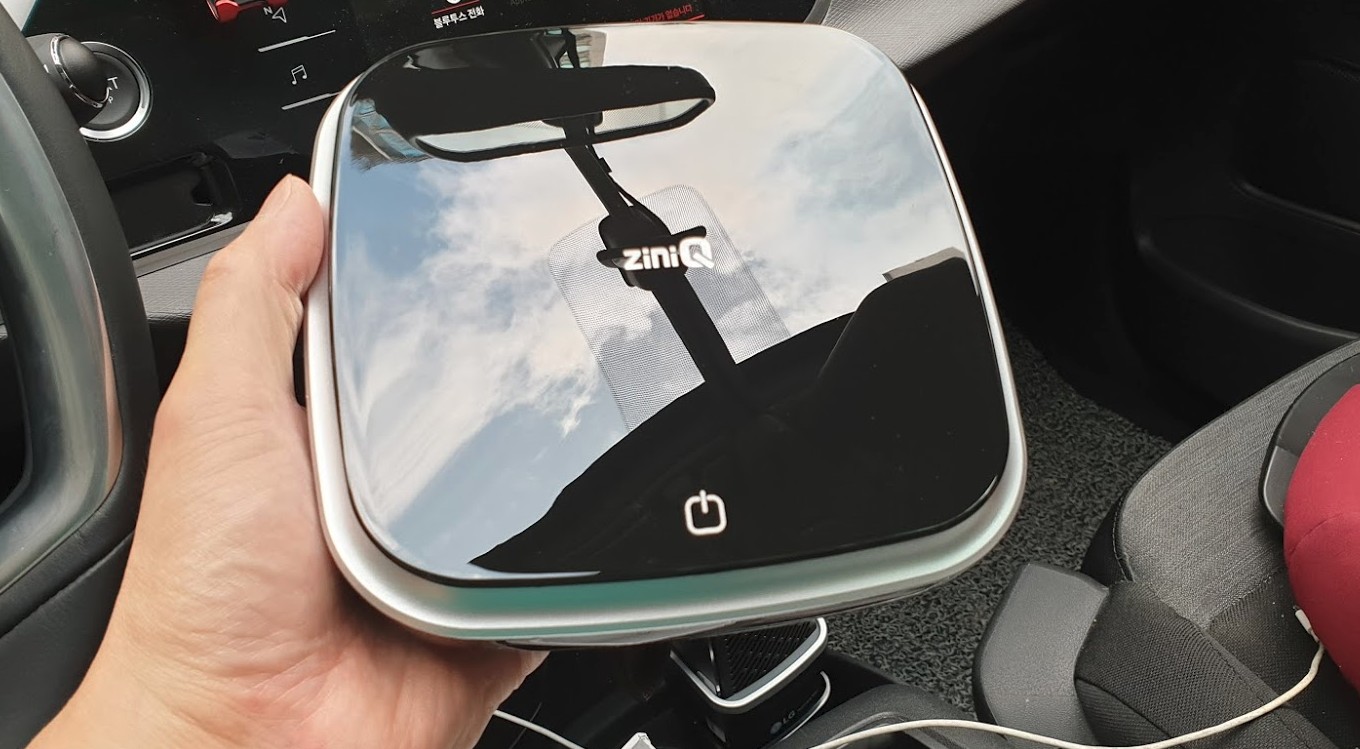 차량용 공기청정기 ZA-Air400 본체 입니다. 상단 부분이 굉장히 광이 많이 나네요. 하늘이 비치는게 그렇죠? 가운데 모델명인 ziniQ 가 로고로 박혀 있고 아래에는 전원 버튼이 있습니다. ZA-AIR400 의 경우에는 전원 버튼 이외에 다른 버튼은 없습니다. 전원 버튼을 누르면 녹색 LED 가 들어와서 공기정화 기능이 동작을 하고 다시 누르면 꺼집니다. 심플하죠?